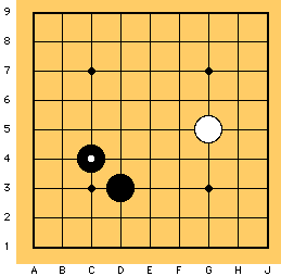 Questo si chiama salto di due spazi.Anche se è più ampio e dà più territorio, è pù probabile che le due pietre siano separate dall'avversario perch&ecaute; c'è più spazio tra di loro.