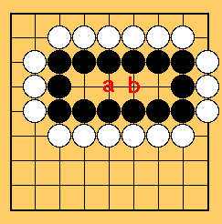Se bianco gioca una pietra in a, rispondigli facendo una mossa in b. A bianco b rispondi in a. I punti a e b sono equivalenti e se non ti distrai l'avversario non potrà giocare in entrambi: quando gioca in uno, tu giochi nell'altro. L'avversario lo sa e non proverà neppure a farlo, così non sarai costretto a fare realmente due occhi: l'importante non è averli, ma poterli sempre fare.